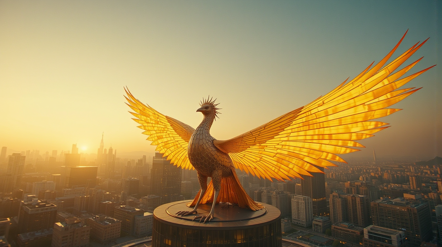 描述:城市中心,地震纪念碑已蜕变为记忆合金凤凰雕塑,夕阳的金辉洒在它展开的羽翼上,每一片羽毛都是一块微型纪念碑,镌刻着灾后重建的故事。当居民们的灾后心愿被逐一完成,凤凰的羽翼便会生长出新的羽毛,此刻第一千零一片羽毛正缓缓舒展,触发了全城的光影联动——千米长的金色投影覆盖了天际线,玻璃幕墙上流淌着如海洋般的光芒,智能路灯齐变涅槃火的橙红色。站在街头的人们抬头仰望,看着这只象征重生的凤凰在暮色中绽放,心中涌动着对未来的无限希望。