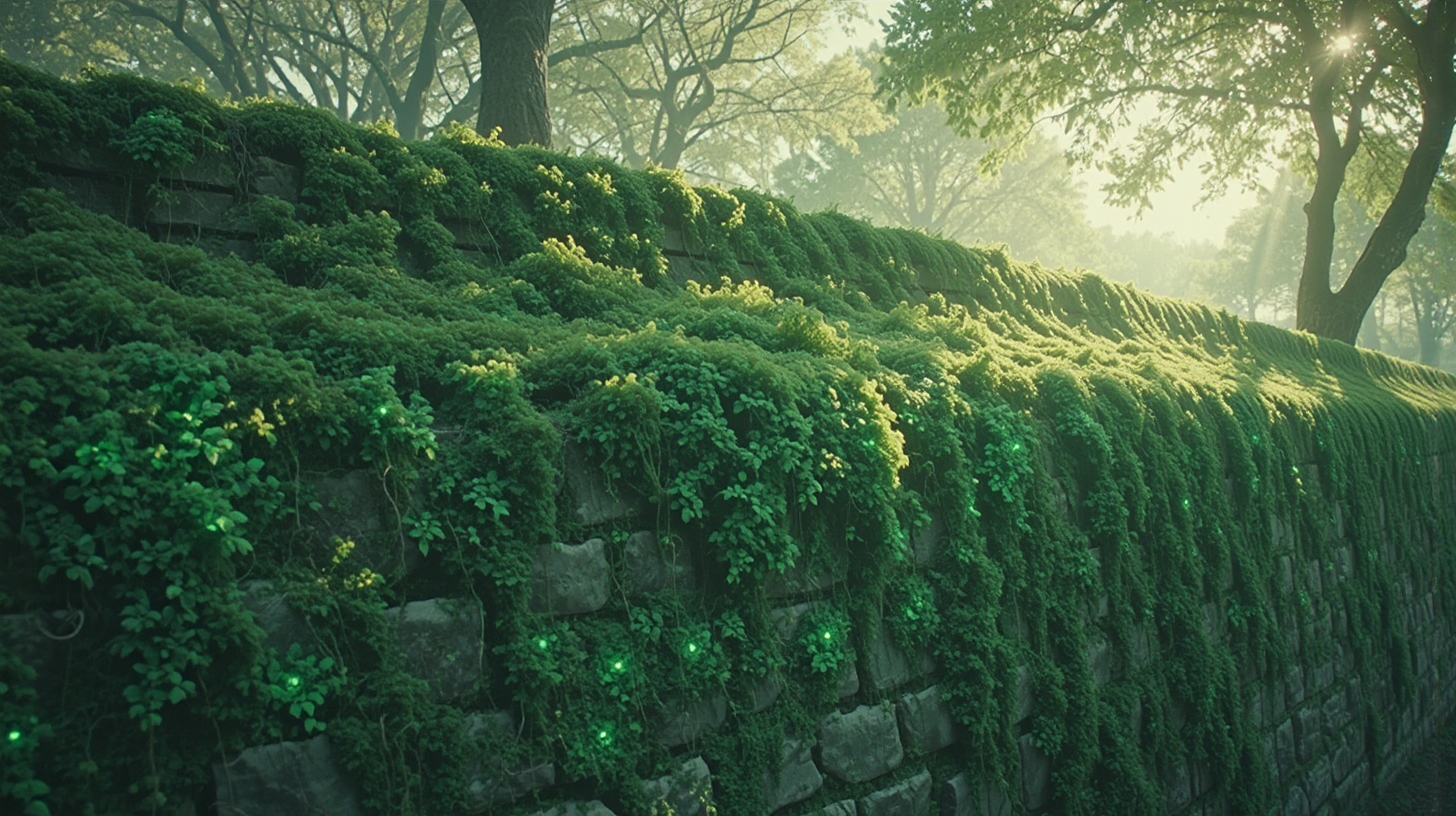 作图提示词:anime surrealistic fantasy, A side view of Xiangyang’s ancient city wall covered in breathing bioluminescent moss that pulses with soft green light. The intelligent moss forms intricate patterns across the weathered stone surface, creating a living tapestry of light and shadow. Sunlight filters through nearby trees, casting dappled patterns that interact with the glowing moss. The scene blends ancient history with futuristic biotechnology in perfect harmony. .