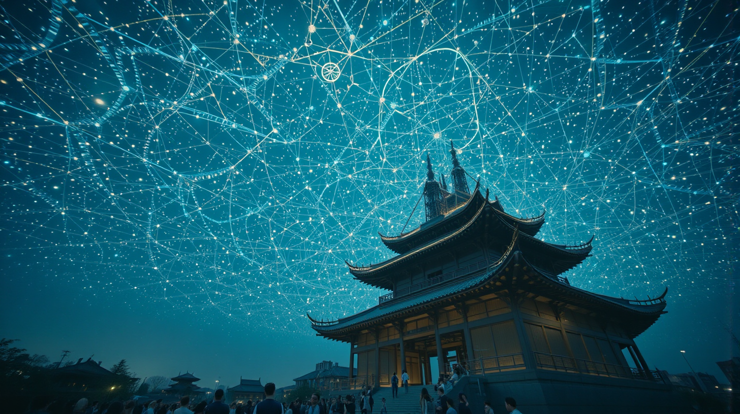 描述:诸葛草庐的石基静静卧在暮色里,上方却悬着神经脉络般的智库穹顶,无数光流如银河般穿梭。有学者投进一个治水构想,光流便织出三维堤坝模型;老农放下农具草图,穹顶立刻涌出生态犁的光影。草庐的石桌上,千年的墨迹未干,与空中跳动的数据流遥遥相对,仿佛诸葛先生的智慧正顺着光流,在新时代长出新的枝芽。晚风拂过竹影,带着古今智慧交织的清响。