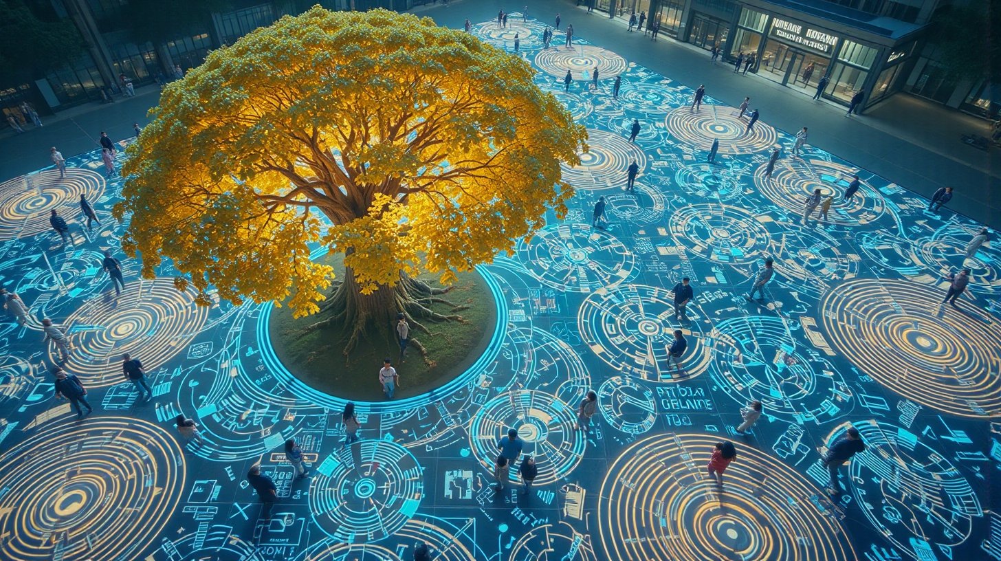 作图提示词:anime surrealistic fantasy, A breathtaking aerial view of Beijie Square in modern Xiangyang, Hubei, where interactive floor tiles display real-time citizen emotional data through vibrant neon holograms. A millennium-old ginkgo tree at the center has been enhanced with bioelectric nanotechnology, its leaves emitting a soft bioluminescent glow that pulses rhythmically. The square thrums with dynamic energy, creating a mesmerizing fusion of futuristic technology and cultural heritage. Shot with a wide-angle lens to emphasize the scale, using the tree’s natural illumination and ground patterns as primary light sources to create ethereal shadows. Color palette balances warm amber bioluminescence with cool neon blues, with shallow depth of field focusing on the tree’s textured bark against the swirling data visualizations. .