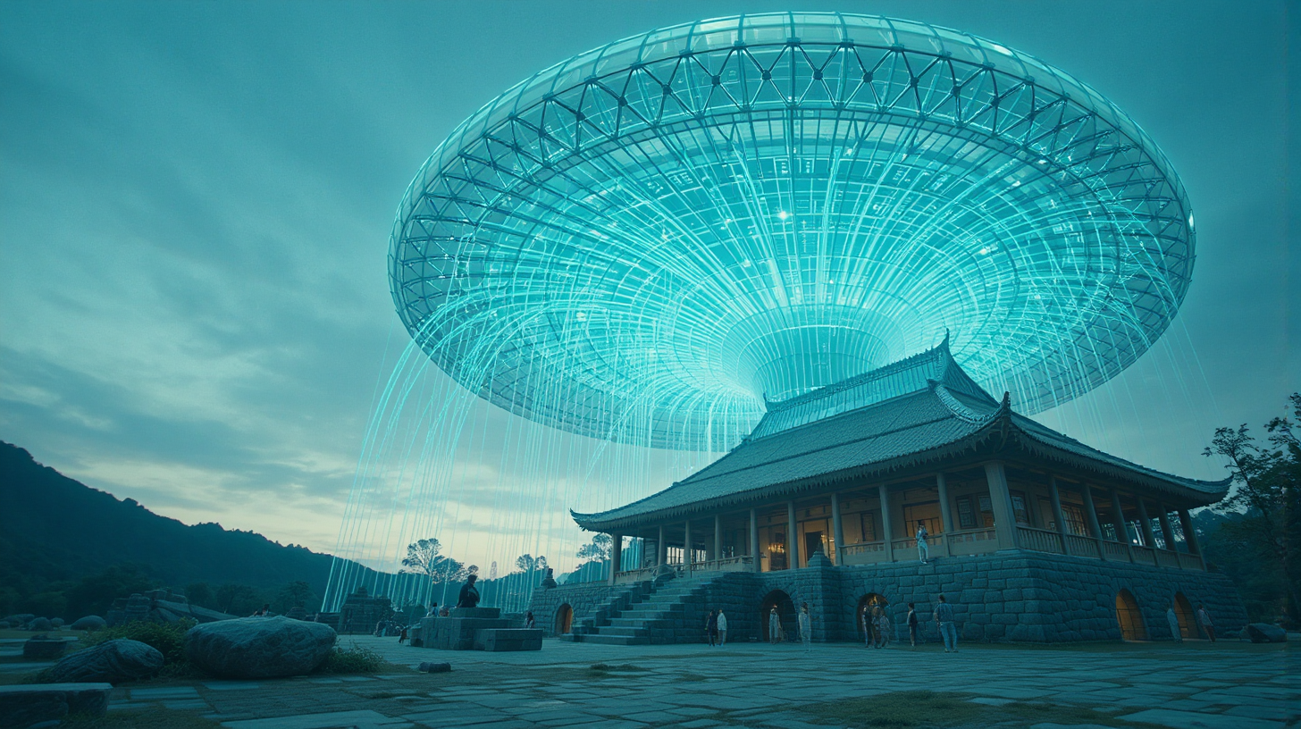 作图提示词:anime surrealistic fantasy, A majestic low-angle shot of the Zhuge Liang’s Thatched Cottage ruins with a massive neural-pulse shaped knowledge dome floating above it. Countless streams of glowing data flow through the transparent dome’s intricate pathways, creating a mesmerizing light show against the twilight sky. The ancient stone foundations contrast beautifully with the futuristic structure above, symbolizing the connection between historical wisdom and modern innovation. .