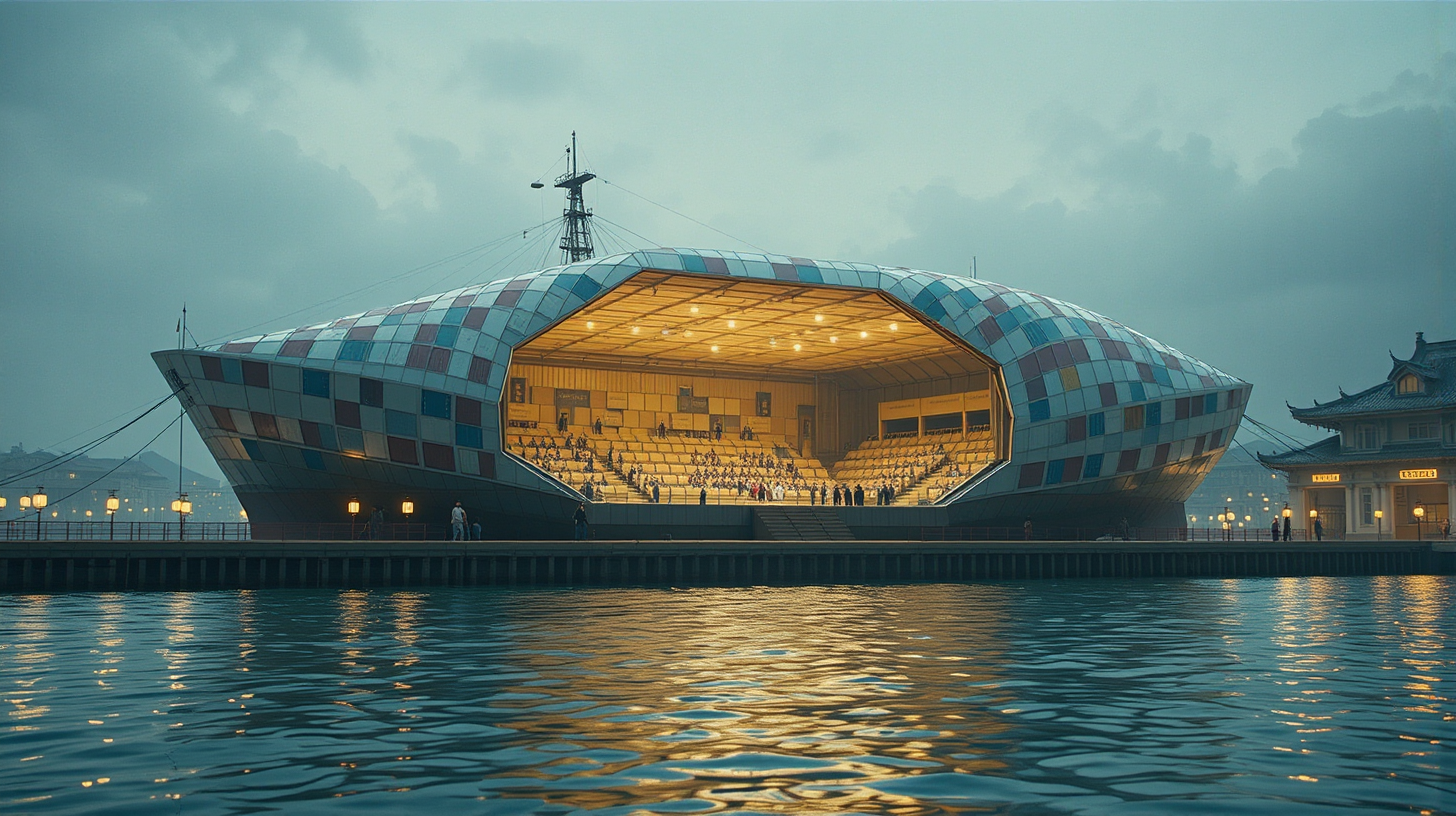描述:襄阳码头的石岸还留着百年前的缆绳勒痕,泊着的货船却正像折纸般舒展——货舱翻折成看台,甲板铺开成星空舞台,连船舷都长出流光溢彩的栏杆。红灯笼在岸边轻轻摇晃,映得水面一半是暖红,一半是船身渗出的冷蓝。机械鱼群跃出水面,化作楚汉纹样的全息幕布,远处传来《楚辞》吟唱的调子,混着船身变形的轻响,像是码头在把漕运的往事,酿成了水上的新戏。