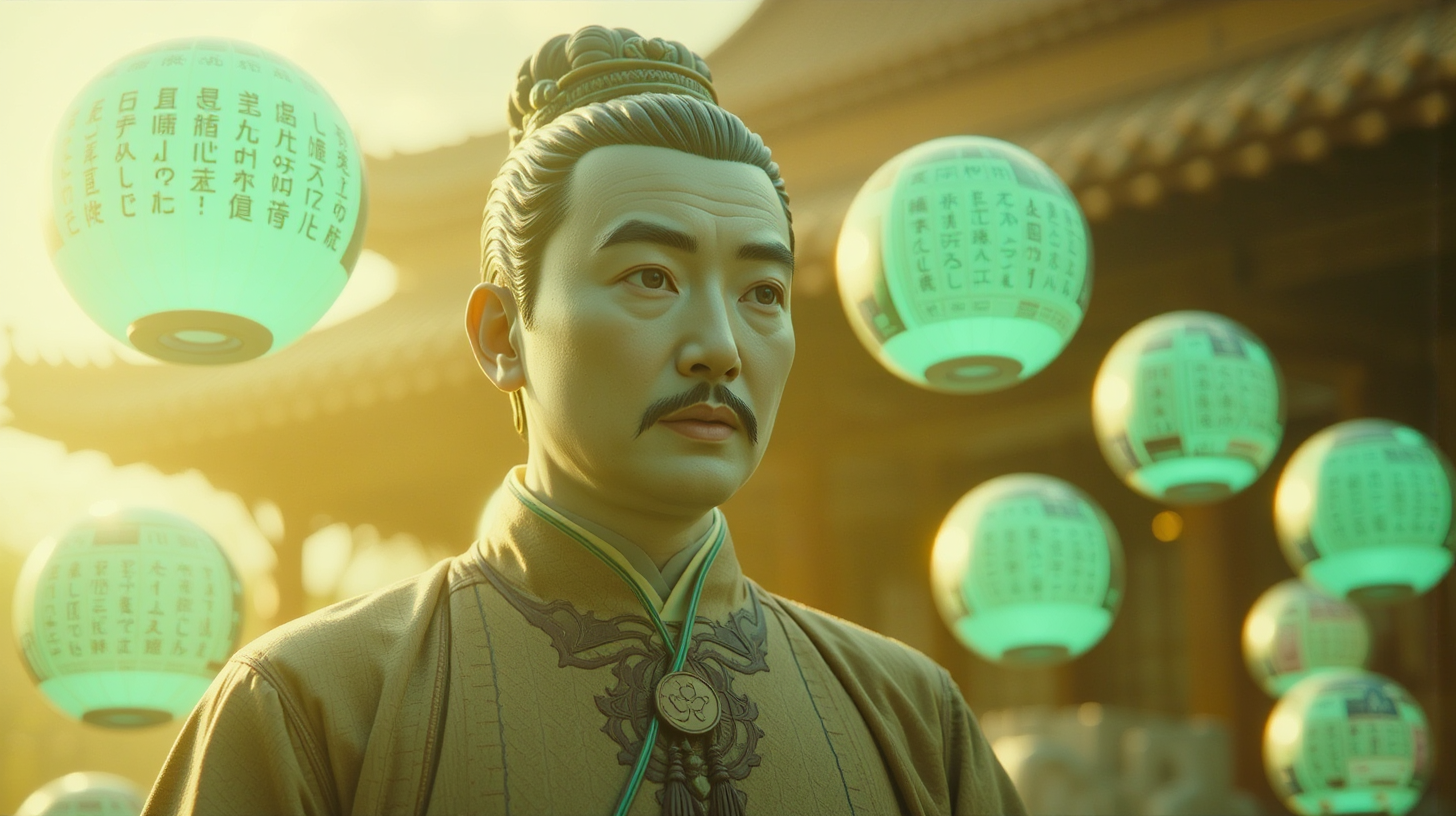 作图提示词:A photorealistic statue of Zhang Zhongjing in authentic Han Dynasty robes, surrounded by floating orbs containing digitized versions of medical texts. Warm golden backlighting creates rim lighting on the statue’s features while cool green LED accents illuminate the holographic displays. Medium telephoto shot at 85mm f/1.8, shallow depth of field keeps the statue’s face sharp while blurring the background’s traditional architecture into bokeh shapes, shot at golden hour for perfect white balance.