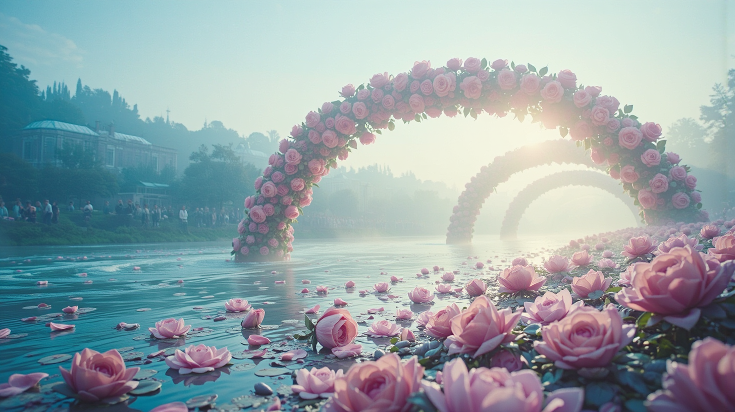 作图提示词:An impressionistic riverscape where genetically enhanced roses form arching structures. Shot at dawn with 24-70mm zoom at 35mm, f/8. Backlit petals glow with morning light diffused through custom gradient filters. Time-lapse elements show petal movement, while carefully placed LED arrays create the illusion of organic displays. Color graded for vibrant pinks against cool river tones, with mist effects enhancing depth perception.