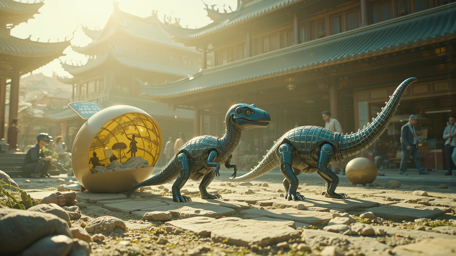 描述:西峡的恐龙蛋化石群在晨光中裂开,半机械的幼崽探出头来:碳纤维鳞片反射着阳光,背部的太阳能板如翅膀般展开,尾巴末端正投射出立体交通图。它们温顺地漫步在青石板路上,尾巴扫过之处,光纹便勾勒出最优路线。古老的城墙与幼崽的机械嗡鸣相映,侏罗纪的苍茫与未来的智能在此交融,为古城的晨添了几分奇幻。