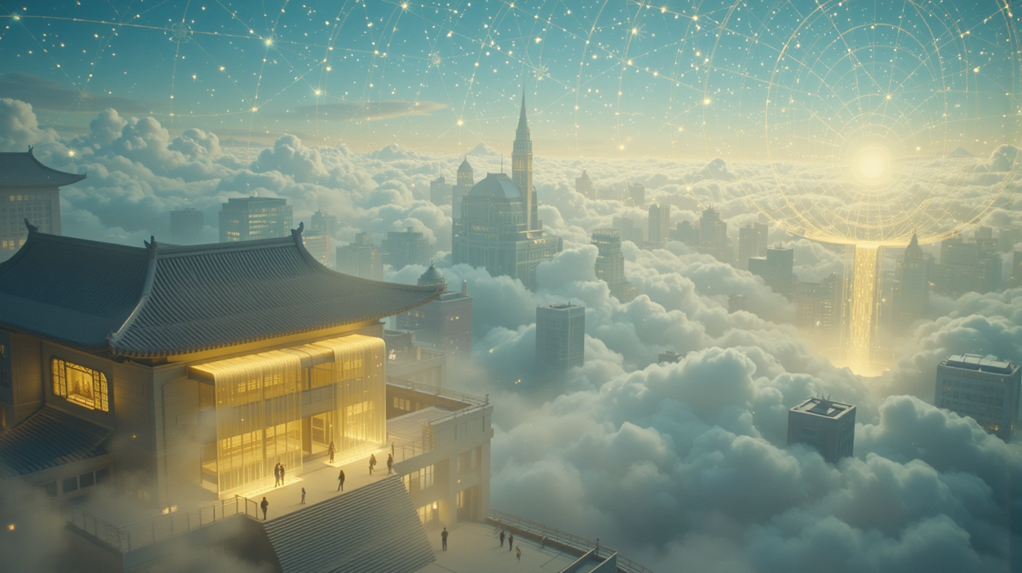 作图提示词:A breathtaking cyberpunk-inspired night scene where augmented reality star maps from the Han Art Museum’s quantum projection system illuminate the cloud layer. Citizens interact with the ‘Twenty-Eight Mansions’ energy matrix through neural-linked AR interfaces, their collaborative efforts generating cascading golden particle waterfalls. Shot with a 16mm ultra-wide lens from a high-altitude drone perspective to emphasize both the celestial spectacle and urban scale. Lighting combines cold atmospheric moonlight (4500K) with warm golden energy streams (3200K), rendered with ray-traced reflections in 12K resolution. The composition follows the rule of thirds with the particle waterfall along the right vertical line, while the ancient museum architecture provides grounding contrast to the futuristic light show. Depth is enhanced through volumetric fog and light scattering effects.