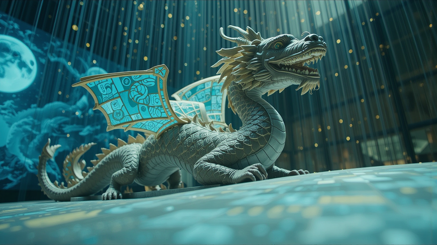 作图提示词:A hyper-detailed museum diorama featuring a Han Dynasty stone carving of Yinglong dragon, with artfully projected holographic wings creating an illusion of movement. The dragon’s scales reflect laser-etched motifs from ‘Chang’e Flying to the Moon’ legend. Museum ambient lighting casts ethereal blue and gold hues through suspended quantum-dot particles. Shot with 14mm lens at f/2.8 from low angle, capturing both the ancient artifact and its futuristic projections in crisp focus, ISO 800 for rich shadow details.