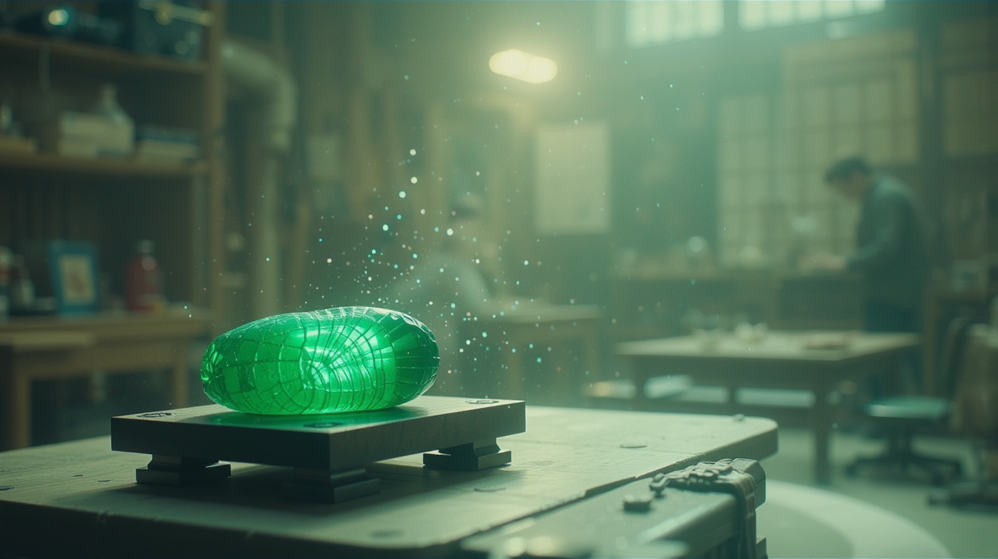 作图提示词:A cinematic workshop scene where prismatic lighting effects simulate jade transformation. Emerald stone placed on traditional carving bench with carefully staged refraction patterns. Macro lens captures emerald’s internal fissures at 1:1 magnification, f/16 for maximum depth of field. Cold cathode lighting from below creates ethereal glow, while practical tungsten lights maintain warm workshop ambiance. Post-processing adds subtle particle effects to suggest transformation.