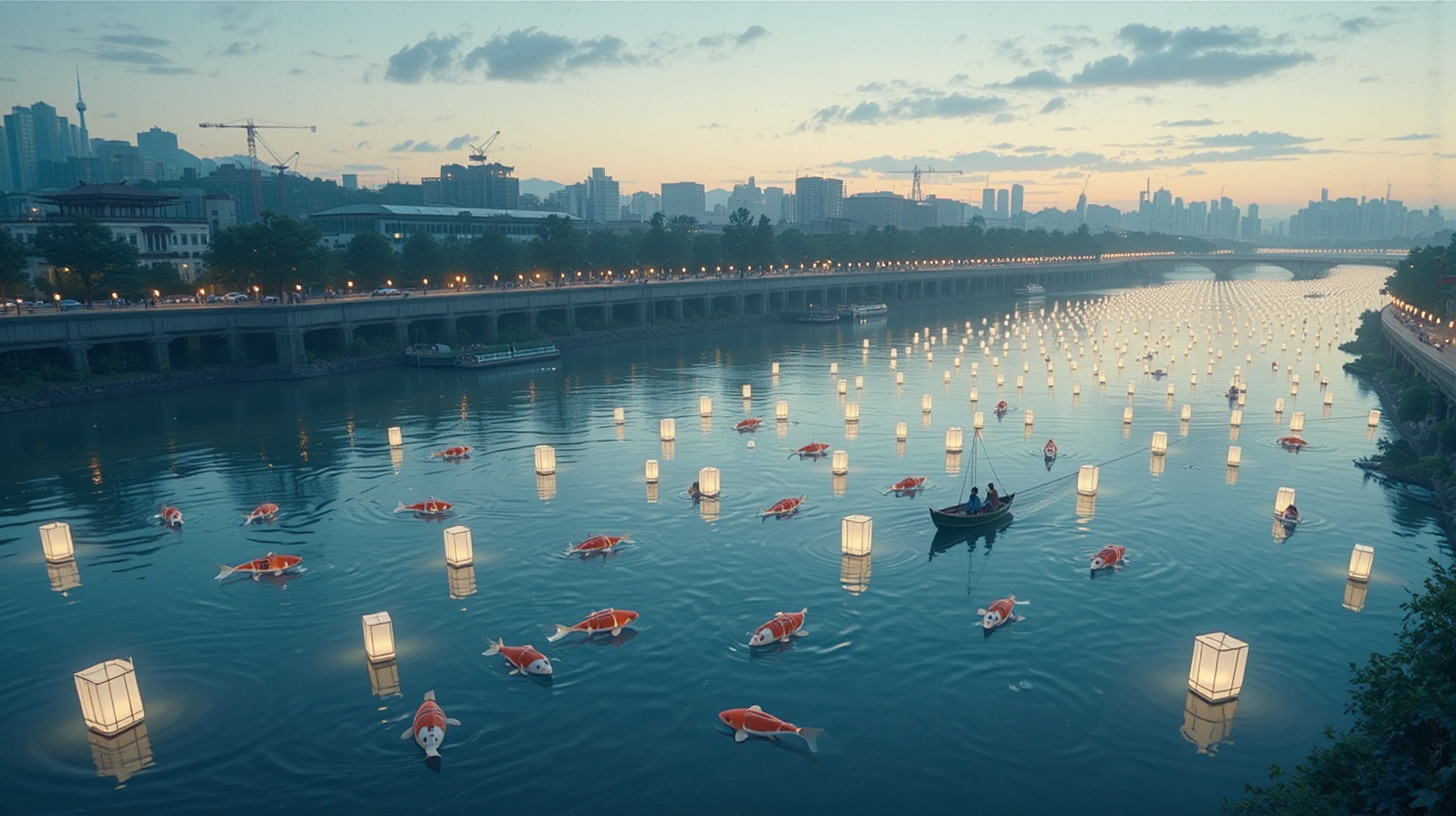 作图提示词:A panoramic aerial view of the Wei River at dusk, featuring glowing quantum fishing lanterns that float gracefully on the water’s surface. Below, bionic koi robots swim through the river, collecting microplastics. As the energy neural network along the bank detects a rainstorm, the lanterns shift to a gentle pulse mode, transmitting flood control instructions via light codes. This scene beautifully merges ecological innovation with traditional river culture, illuminated by rhythmic lights against the twilight sky.