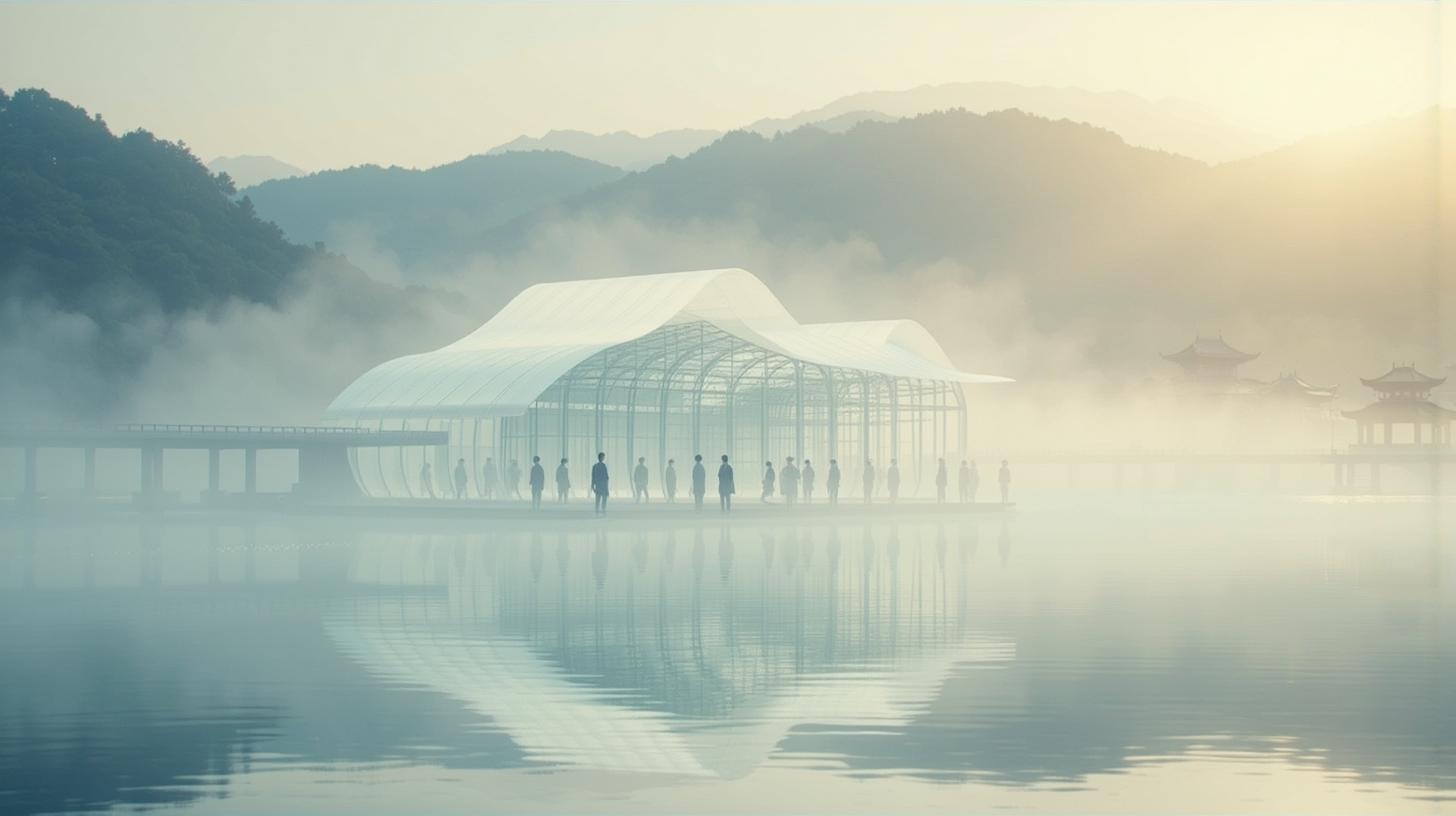 作图提示词:A serene dawn scene at Xianyang Lake, where a futuristic library emerges from the mist, composed of shimmering memory capsules. Glowing story scrolls unfurl in the air, displaying data on advanced quantum screens inspired by Han dynasty bamboo slips. Soft golden morning light filters through the mist, illuminating the library’s innovative architecture. Peaceful wide shot capturing the reflection on the lake surface, with traditional Chinese pavilions visible in the distance. The scene embodies a harmonious fusion of cutting-edge technology and ancient cultural elements, set in a plausible near-future timeline.