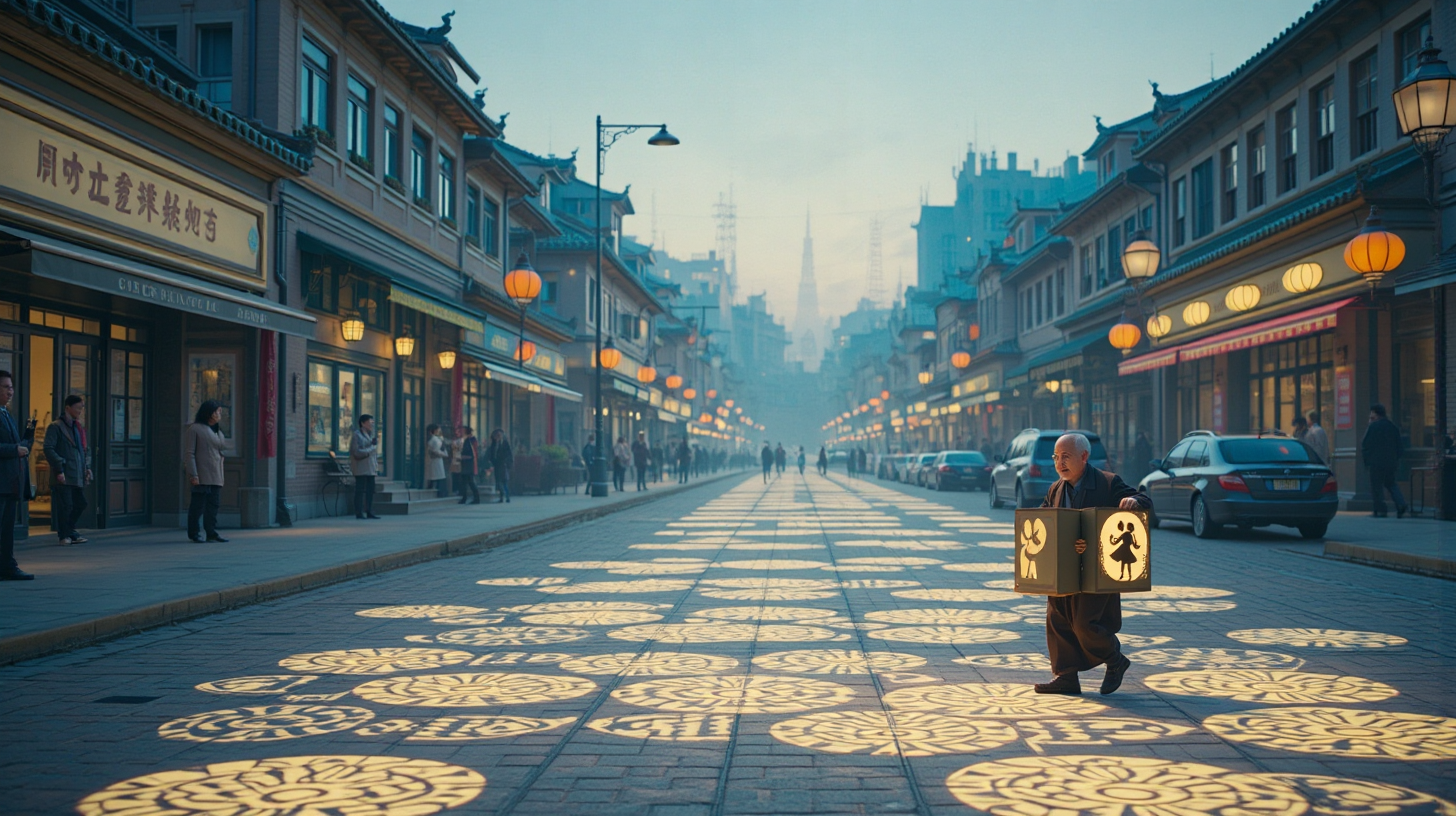 作图提示词:A medium shot of Xianyang’s main thoroughfare at dusk, where dynamic glowing brocade patterns illuminate the pavement. An elderly man carries a smart shadow puppet box that projects interactive Qin opera silhouettes onto the road, triggered by his movements. The scene masterfully blends traditional Chinese artistry with cutting-edge technology, creating a warm, nostalgic atmosphere with rich colors and intricate light patterns.