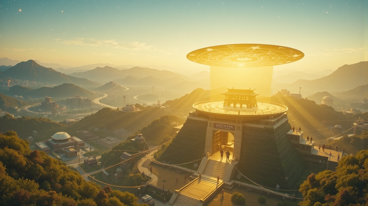 描述:晨光为汉阳陵遗址镀上金边,金色光流如活物般沿着文物修复轨迹游走,那是考古纳米机器人在唤醒沉睡的历史。地宫深处,全息汉代天象图缓缓升起,星辰的轨迹与悬浮空中的量子星轨观测台产生共鸣,一道贯通古今的星桥在晨曦中渐显轮廓。光流流动的嗡鸣与量子共振的空灵音效交织,每一道光影都似在低语千年的故事。