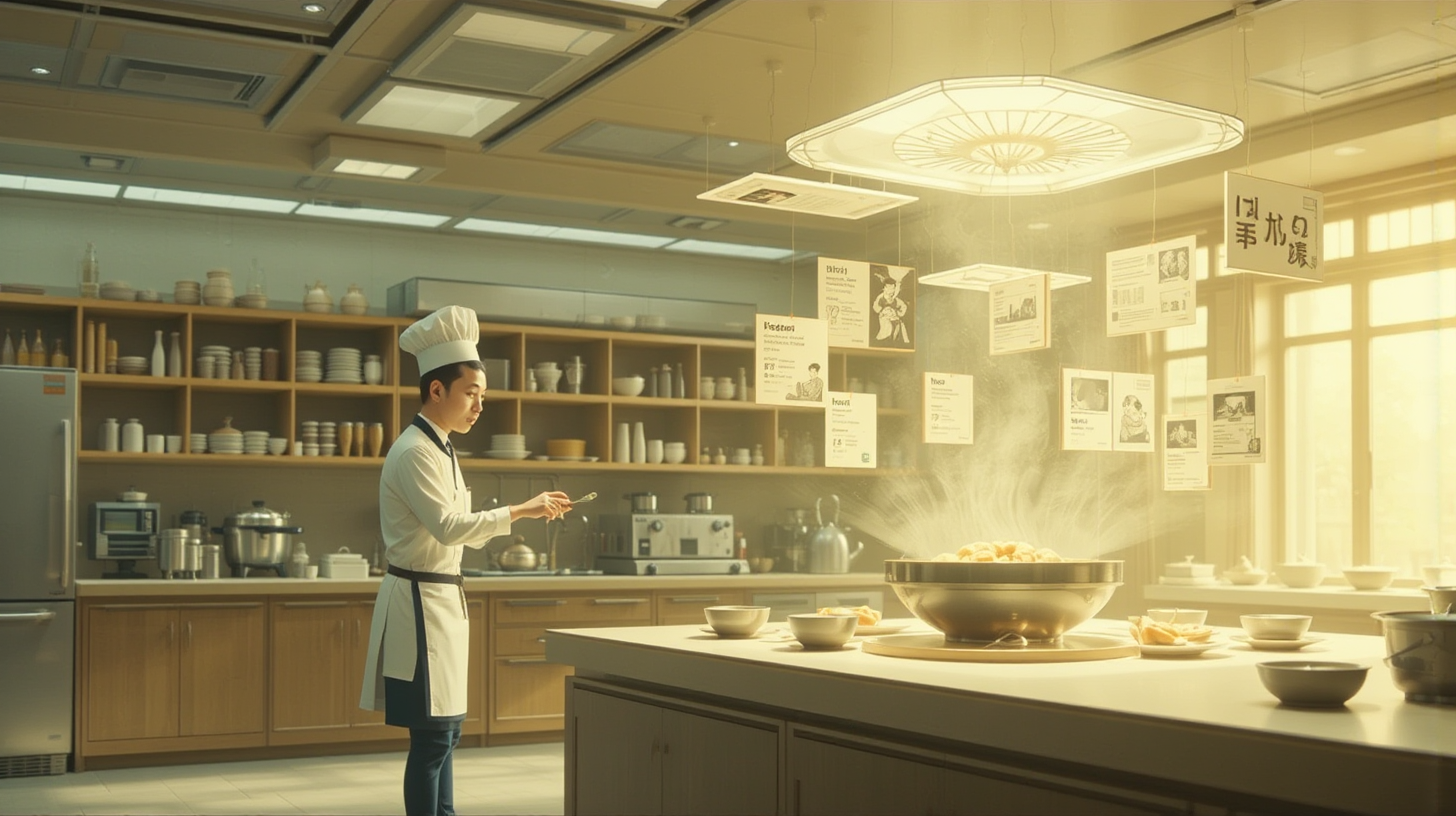 描述:老字号肉夹馍店的量子厨房内,可变形料理台正悄然重组着食材的分子结构。当厨师将家传老酵头轻轻放入容器,整个店铺如被唤醒的巨兽,瞬间展开为多层立体美食工坊。空中,全息菜单缓缓浮现,那是由顾客记忆具象化的历代关中宴席,从秦汉的古宴到如今的家常味,一一流转。暖黄的灯光映着食物的香气,与全息蓝光交织,诉说着味觉与记忆的千年纠缠。
