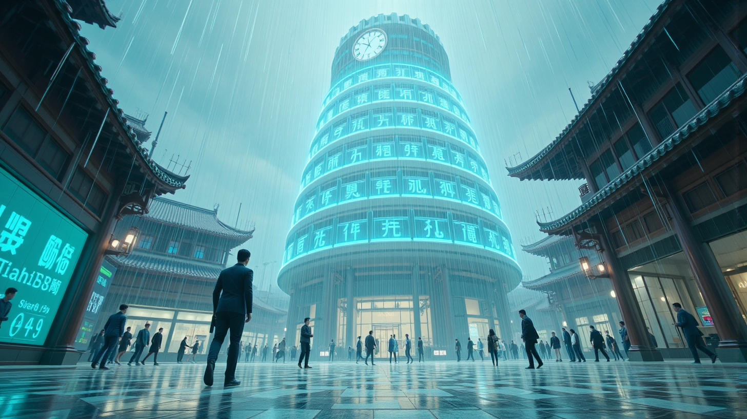 作图提示词:A futuristic city center in Xianyang, China, featuring a towering smart clock tower with advanced holographic displays. The clock tower is surrounded by seven layers of holographic Qin music chimes, each note generated by the brainwave frequencies of passing citizens. Dramatic low-angle shot with neon-blue lighting cutting through a light rain, ultra-wide perspective showcasing the scale of the technological marvel against traditional Chinese architecture. The scene reflects a blend of quantum technology and cultural heritage, set in a near-future era where such advancements are plausible.