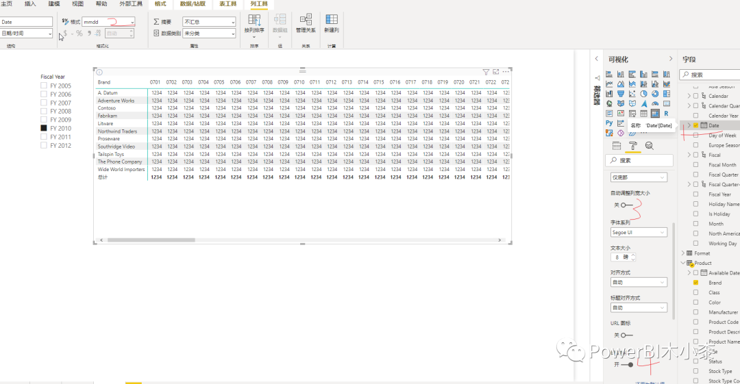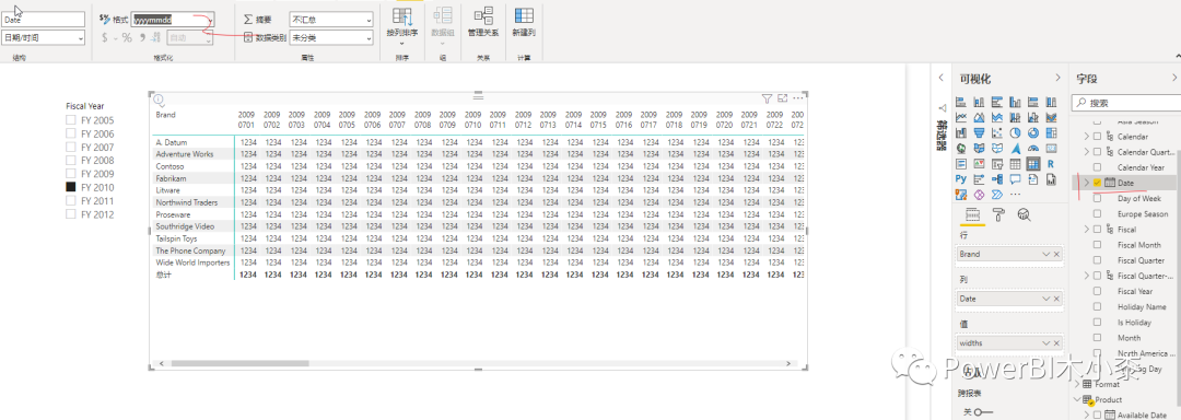 在PowerBI中,矩阵没有直接提供统一列宽的功能,但可以通过创建大值度量和调整列标题格式来实现。首先,创建一个大于销售额的度量值,将其加入矩阵并关闭自动调整列宽。然后,将度量值替换回销售额,即可得到统一列宽的矩阵。对于日期列,可以先改为mmdd格式,关闭自动调整,开启自动换行,再改回YYYYMMDD格式,同样能实现列宽统一。
