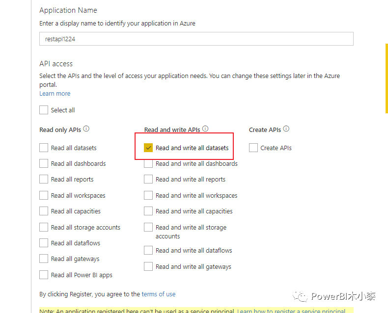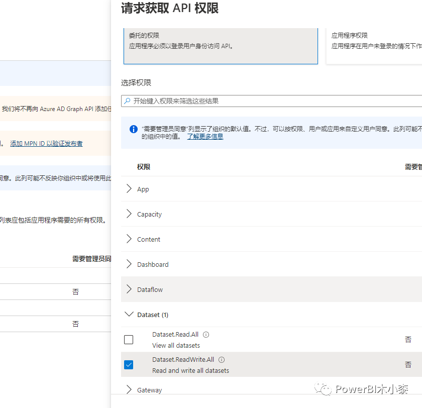 登录后找到应用注册,然后找到刚注册的应用程序,添加权限,选择PowerBI,委托的权限,选择Dataset.ReadWrite.All