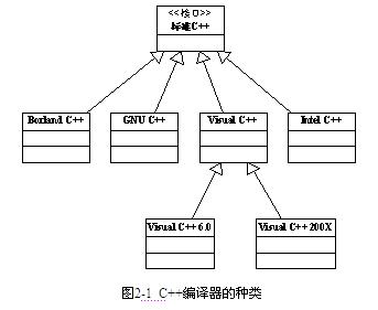 如上这种关系采用UML类图来表示的话,就是图2-1。其中Visual C++ 6.0被单独提出来,是因为它很短小精悍,一直颇受Visual C++程序员的喜爱。