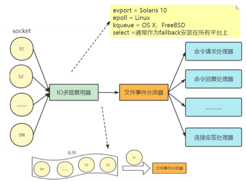 文件事件分派器接收 I/O 多路复用程序传来的socket, 并根据socket产生的事件类型, 调用相应的事件处理器。