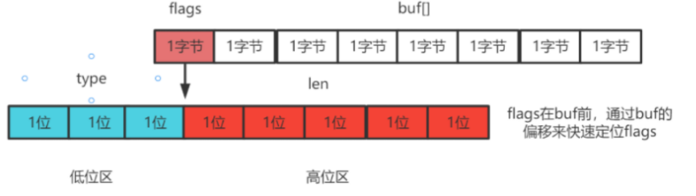分别给1-2个字节给字符串长度len(已使用长度),buf区总存储长度alloc,以及一个flags标识(其中存储对应数据类型type),剩余都是buf区存储位置。