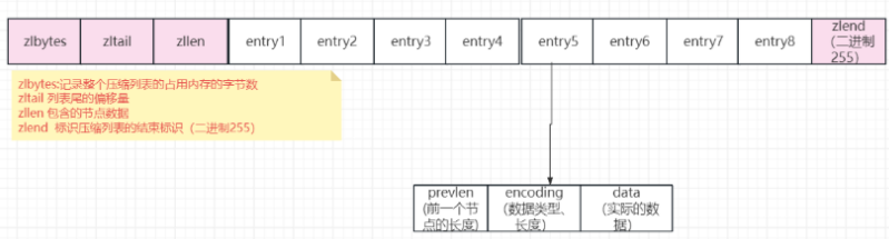 压缩列表本质其实是一个数组而已,但是不同的是,压缩链表表头有三个字段:zlbytes(列表长度)、zltail(列表偏移量)和zllen(列表中entry个数),尾还有一个zlend(标识列表结束)。