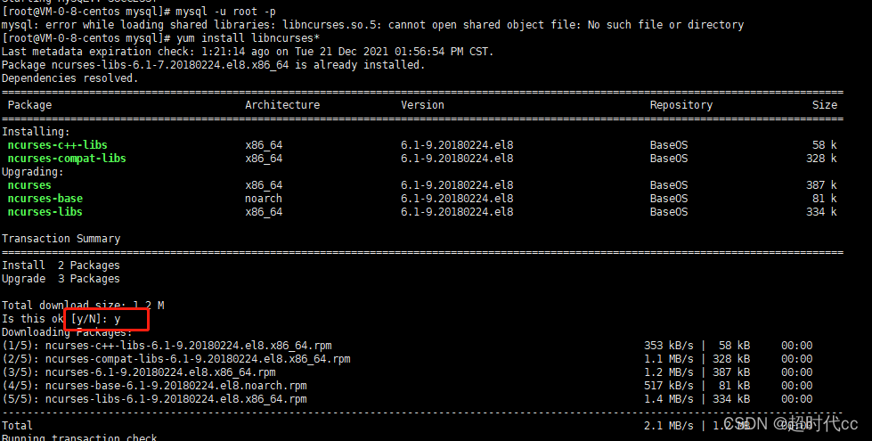 如果出现如下错误:mysql: error while loading shared libraries: libncurses.so.5: cannot open shared object file: No such file or directory