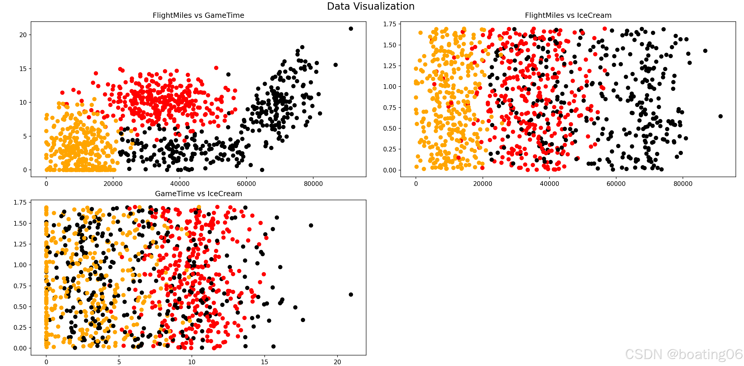 通过不同的散点图展示“FlightMiles”、“GameTime”、“IceCream”与目标标签(“Label”)之间的联系: