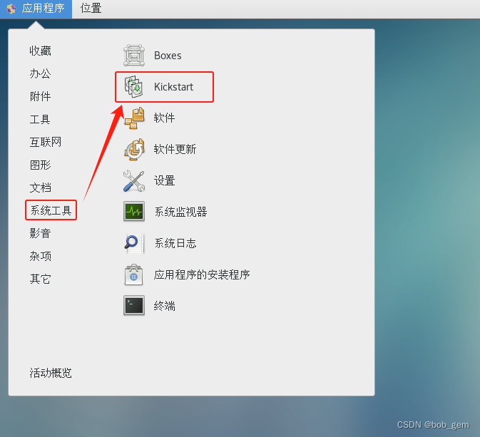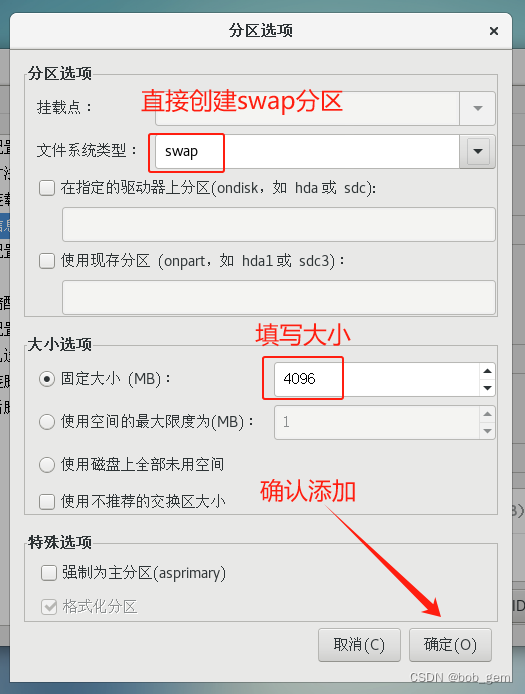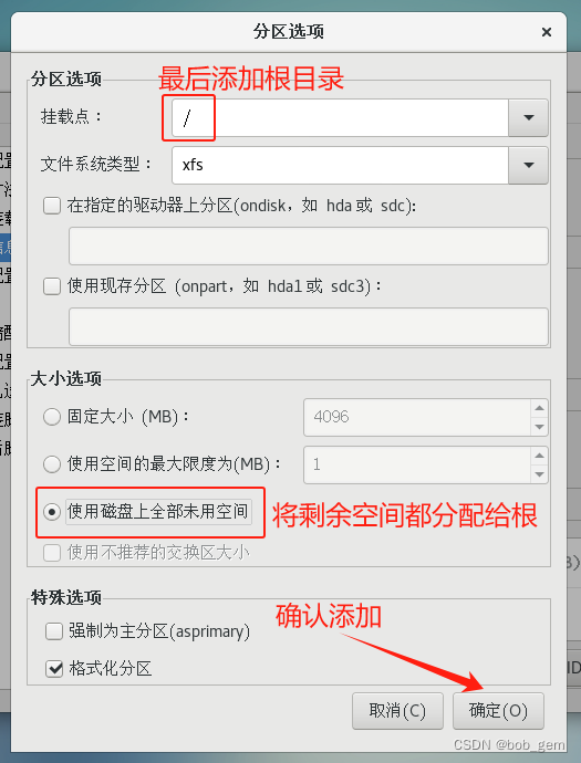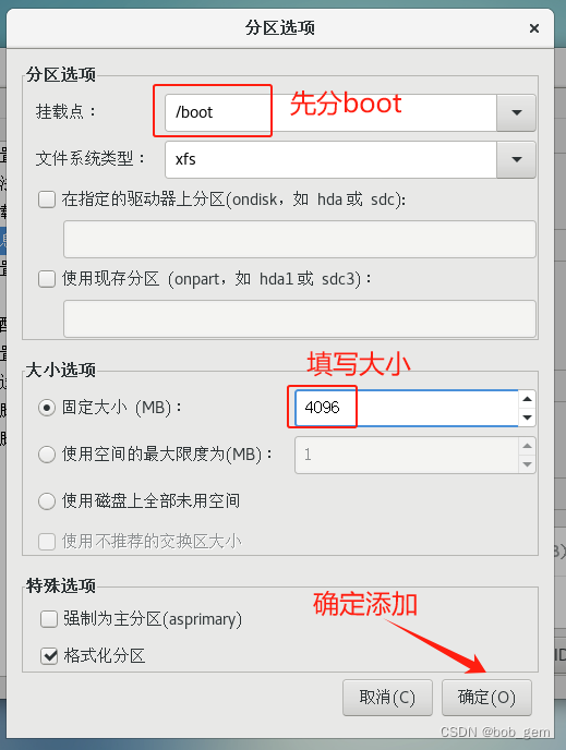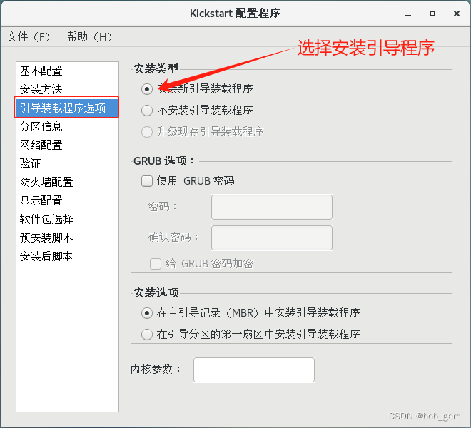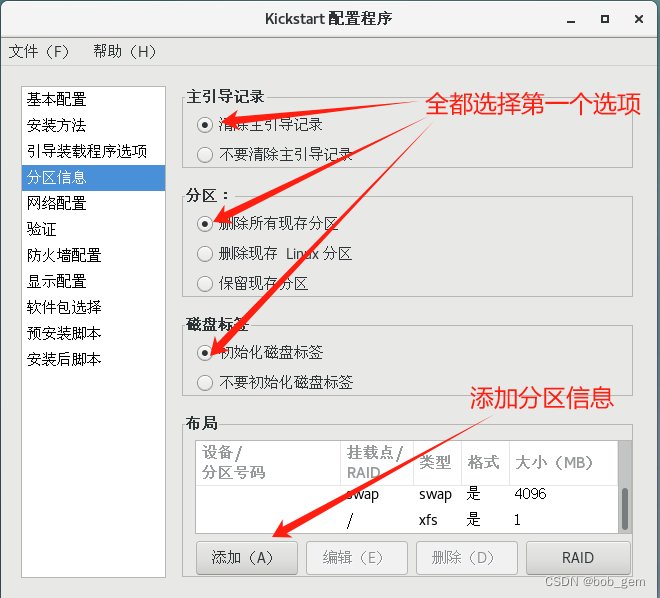 应用程序——>系统工具——>kickstart——>基本配置——>安装方法——>引导装载程序选项——>分区信息——>分区信息-添加
