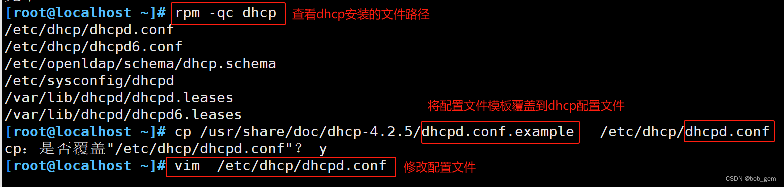 [root@localhost ~]# cp /usr/share/doc/dhcp-4.2.5/dhcpd.conf.example /etc/dhcp/dhcpd.conf