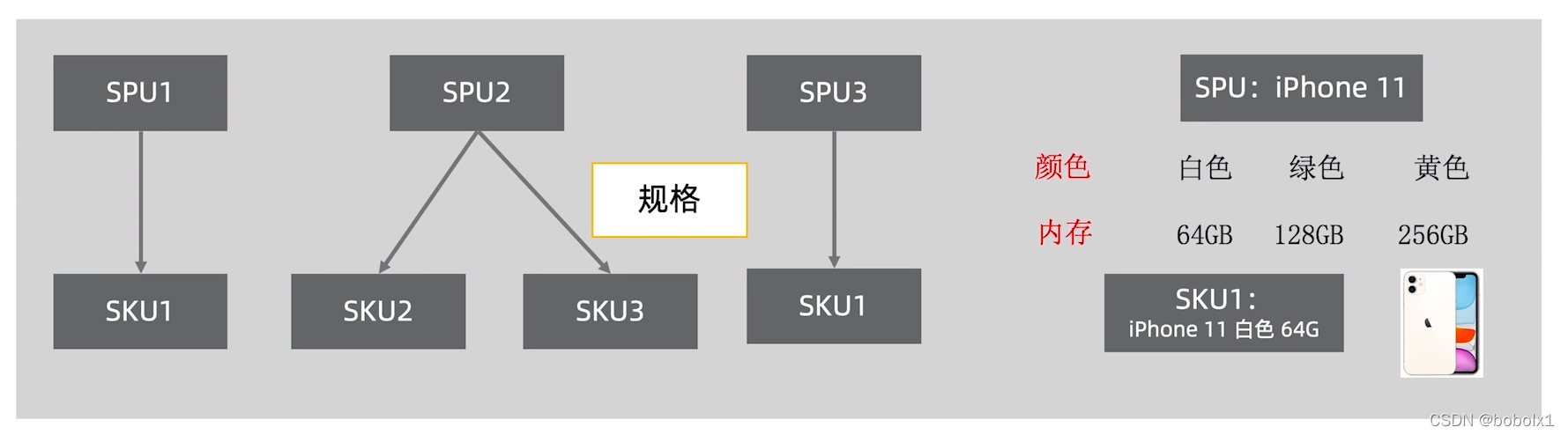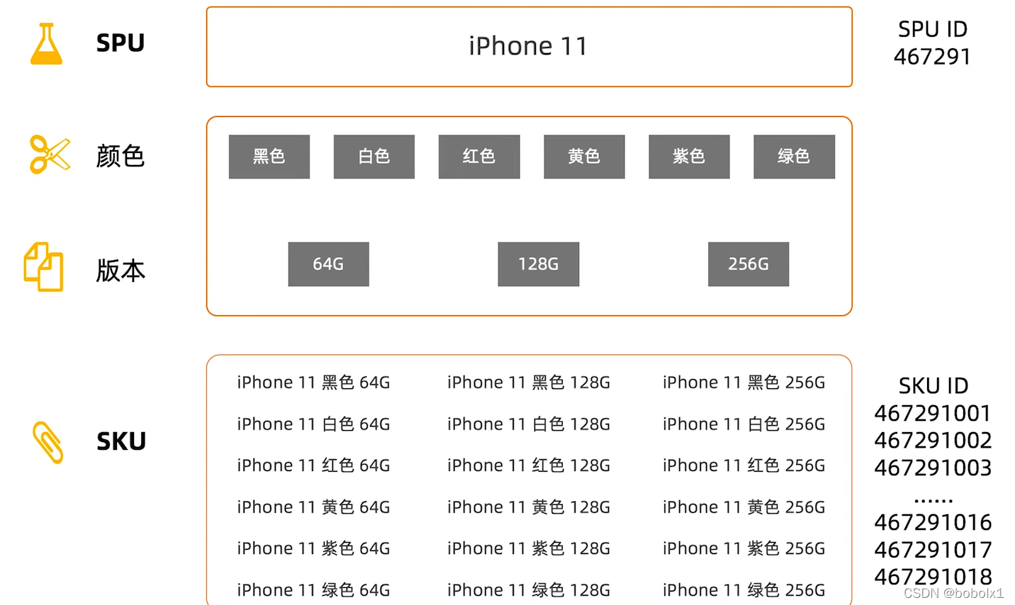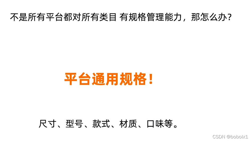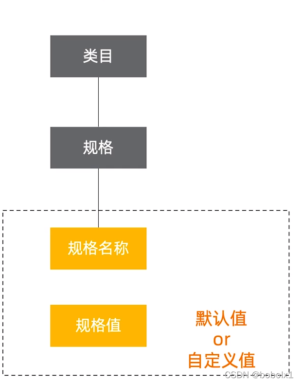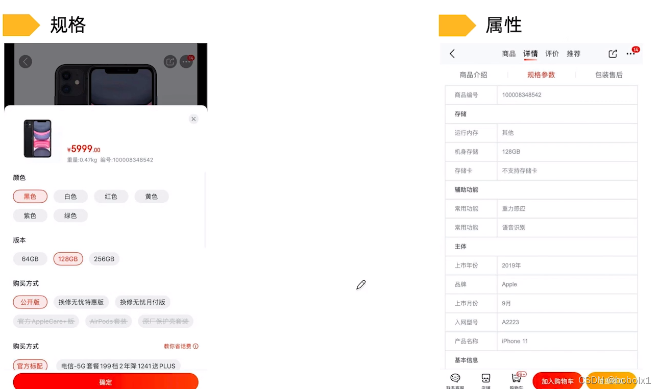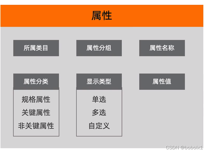 规格属性:也称为销售属性。例如“颜色”、“尺码”,连接SPU和SKU; 关键属性:能够确认唯一“产品”的属性。