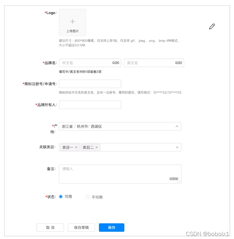 新建品牌,相关字段:Logo、中文名、英文名、产地、备注、状态(可用、不可用)。