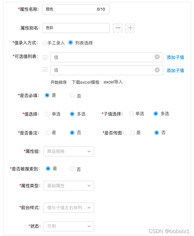 根据商品所属类目确定填写的属性;在用户感知上,不同属性分为“必填/非必填”,每个属性值分为