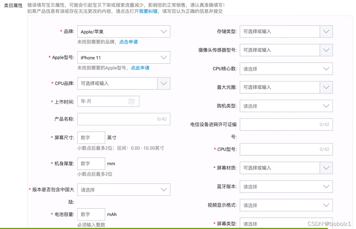 “单选/多选/自定义”。例如屏幕材质是必填项,可选也可以自定义属性值;