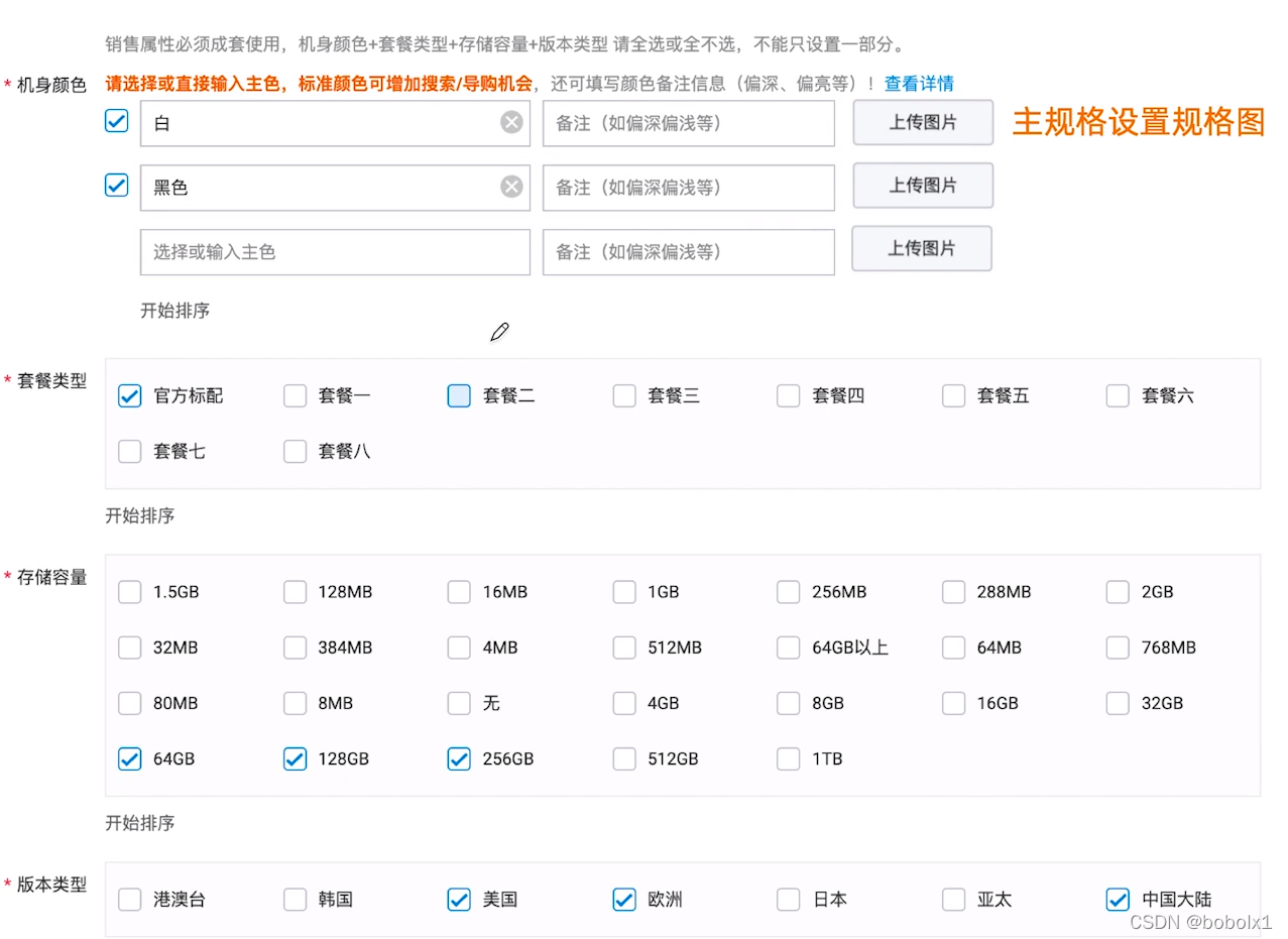 应用场景:对于类目规格没有精细管理能力的企业,或者部分类目无管理能力可以采用这种方式。例如儿童玩具、厨房用品等非标类目。注:可以选择一个主规格,设置对应的规格图。