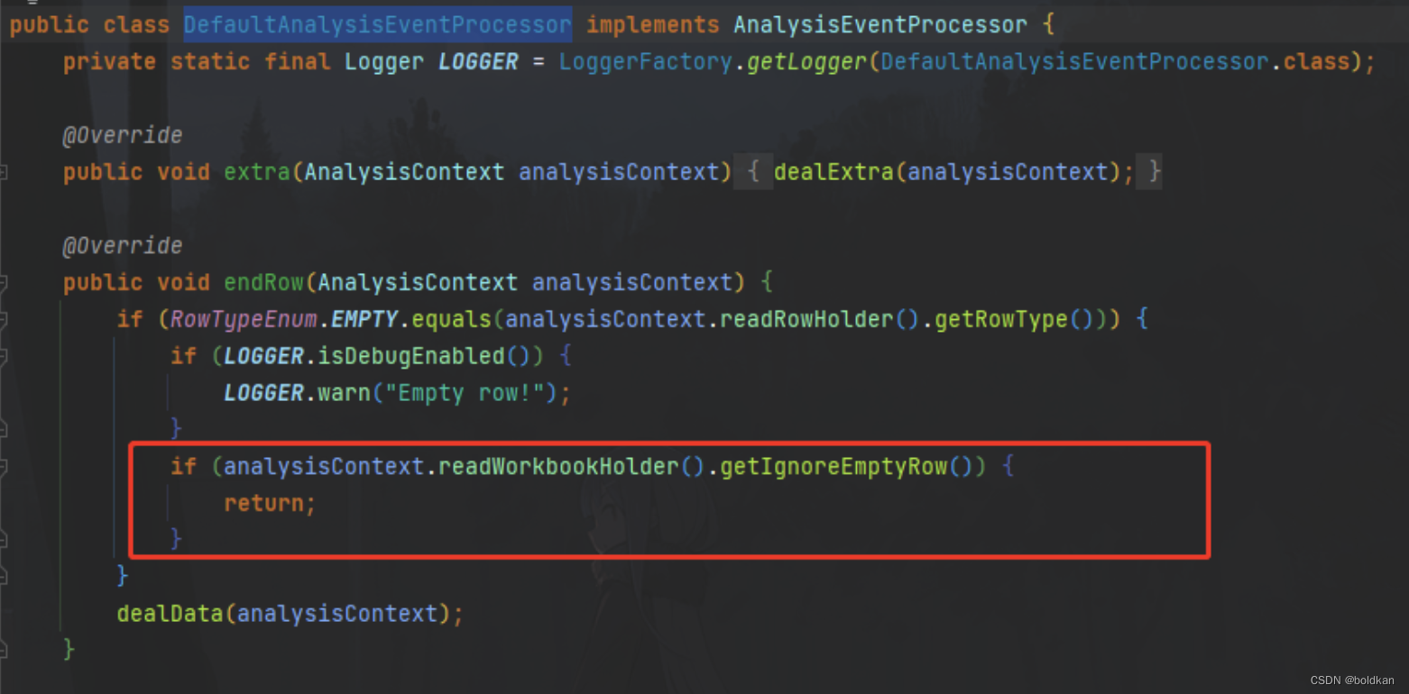 到CsvExcelReadExecutor.execute()的excelReadExecutor.execute()的dealRecord(record, rowIndex++), 再到csvReadContext.analysisEventProcessor().endRow(csvReadContext)