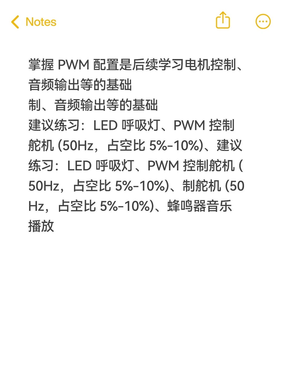 掌握 PWM 配置是后续学习电机控制、音频输出等的基础