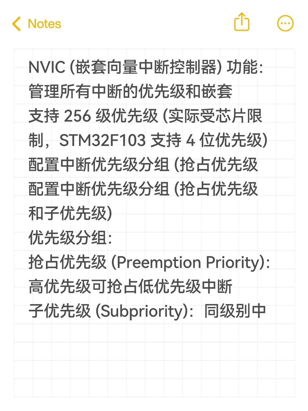 支持 256 级优先级 (实际受芯片限制,STM32F103 支持 4 位优先级)