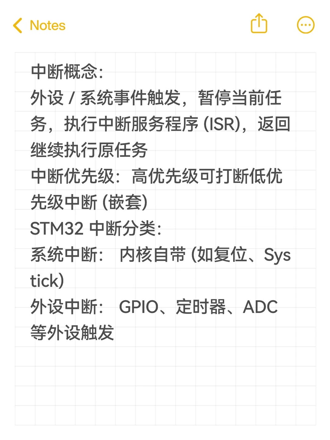 外设 / 系统事件触发,暂停当前任务,执行中断服务程序 (ISR),返回继续执行原任务