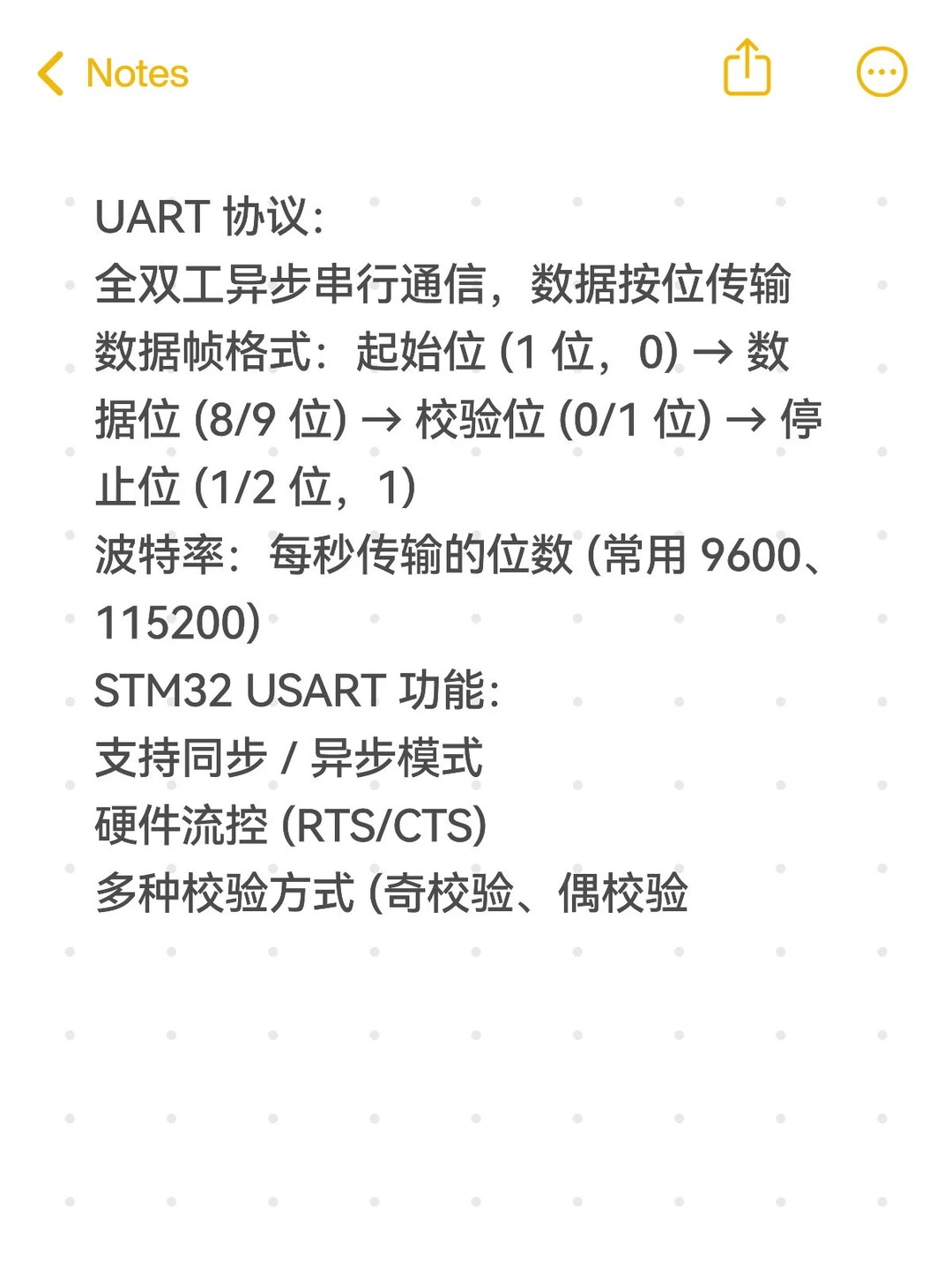 数据帧格式:起始位 (1 位,0) → 数据位 (8/9 位) → 校验位 (0/1 位) → 停止位 (1/2 位,1)