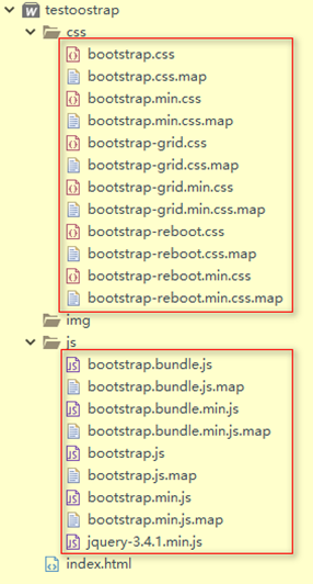 创建项目,将bootstrap中的css下的文件复制进项目的css目录中,bootstrap js目录中的文件复制进入项目的js目录中,截图如下