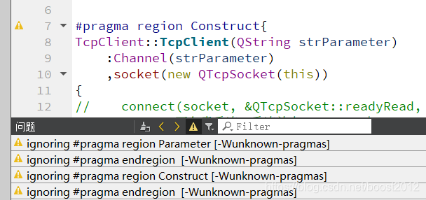 本文介绍如何在Qt中使用region来组织代码,通过预处理器指令实现代码区块的折叠与展开,并提供了解决编译警告的方法。
