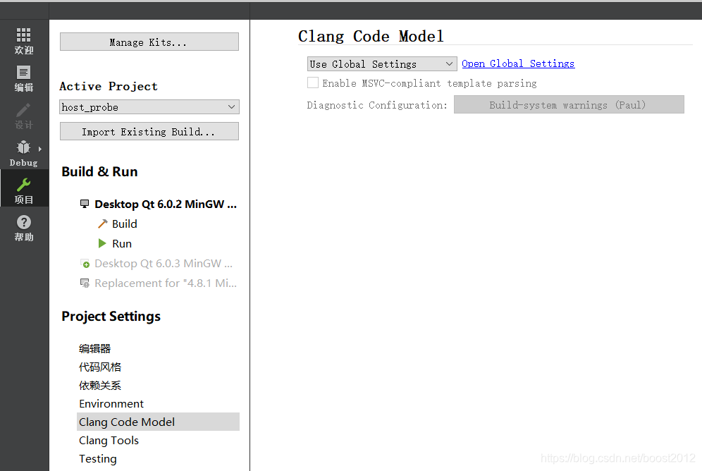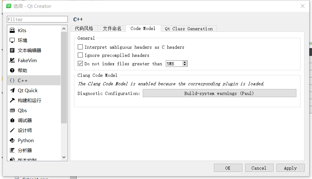 QCreator菜单:工具 ->选项 -> C++ -> Code Model