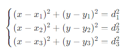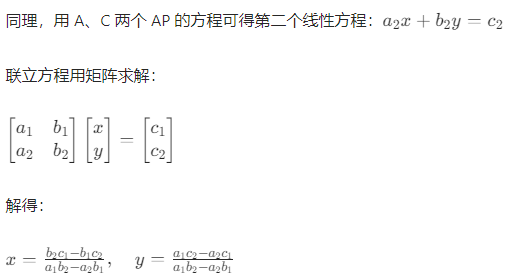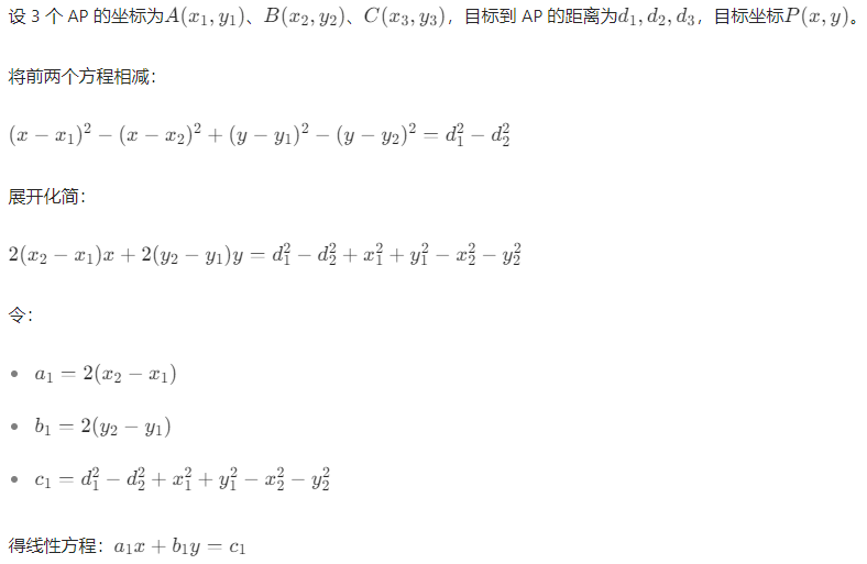 设 AP 坐标为(x1,y1)、(x2,y2)、(x3,y3),目标坐标(x,y)到各 AP 的距离为d1,d2,d3,则: