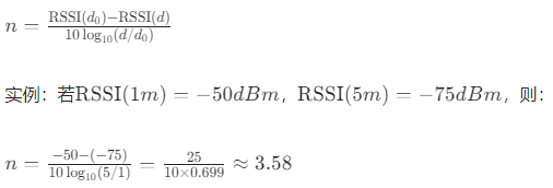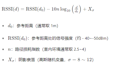 WIFI 信号在室内传播时会因墙壁遮挡、多径效应产生衰减,接收信号强度(RSSI)与距离(d)呈负相关。实际应用中采用对数距离路径损耗模型描述二者关系: