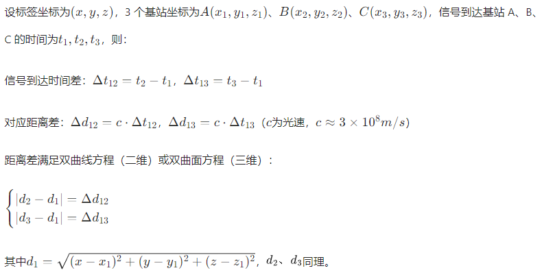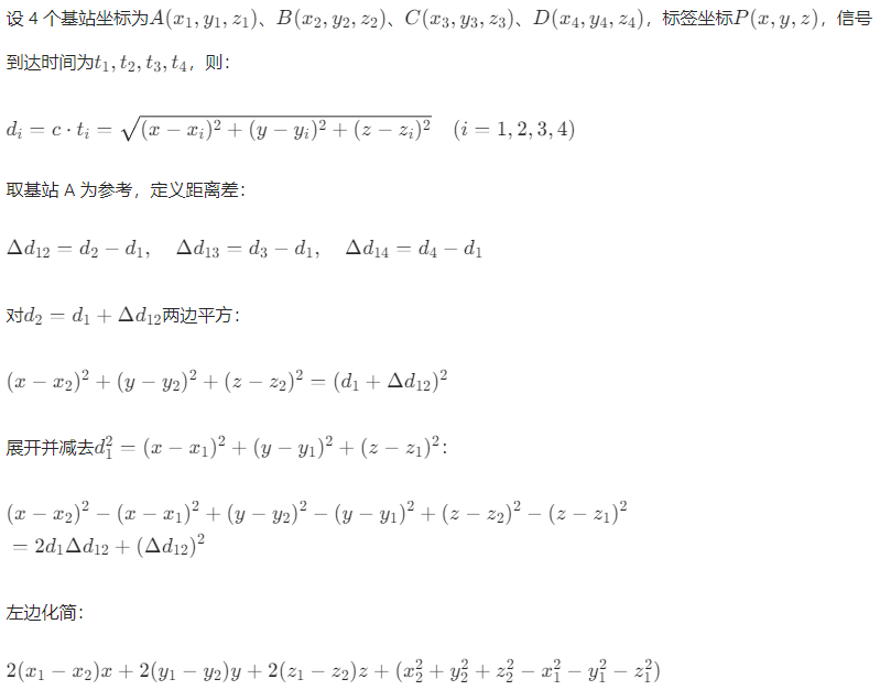TDoA(到达时间差)定位的核心是:无人机(标签,Tag)发射 UWB 脉冲,多个固定基站(Anchor)接收信号,通过信号到达不同基站的时间差,求解标签位置。