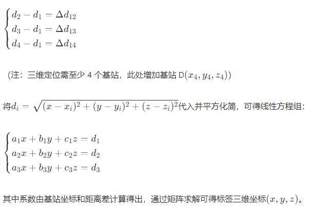 | TDoA(Time Difference of Arrival) | 标签发射信号,多个基站接收,通过到达时间差计算位置 | 基站间严格同步 | 高 | 5-20cm | 高精度需求场景 |