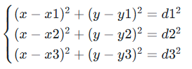 TDOA 定位原理是通过测量信号到达两个不同 Anchor 的时间差,然后根据双曲线定位原理来确定发射端的位置。与 TOA 定位原理不同,TDOA 定位原理不需要精确的时间同步,只需要保证各个 Anchor 之间的时间同步即可。假设信号到达 Anchor1 和 Anchor2 的时间差为 Δt,信号传播速度为 c,则发射端位于以 Anchor1 和 Anchor2 为焦点的双曲线上,双曲线方程为: