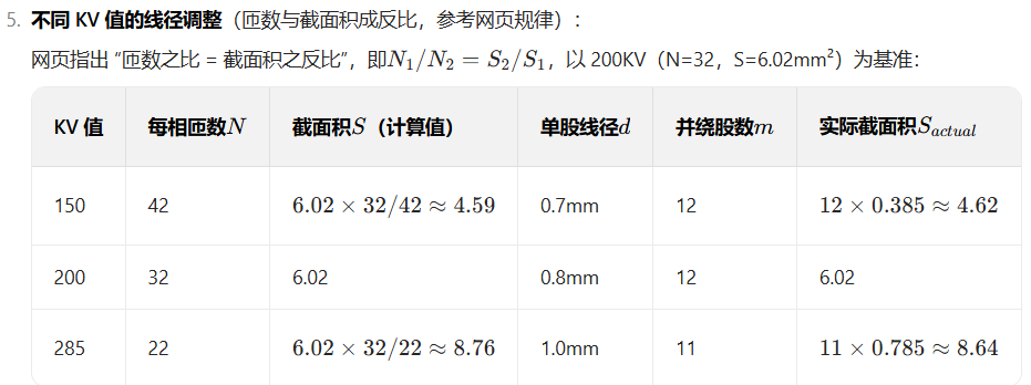 最终选型:T2 紫铜聚酰亚胺漆包线,线径根据 KV 值调整(150KV 用 0.7mm,200KV 用 0.8mm,285KV 用 1.0mm),耐温等级 155℃,绝缘漆厚度 0.03~0.04mm(确保槽满率可控)。