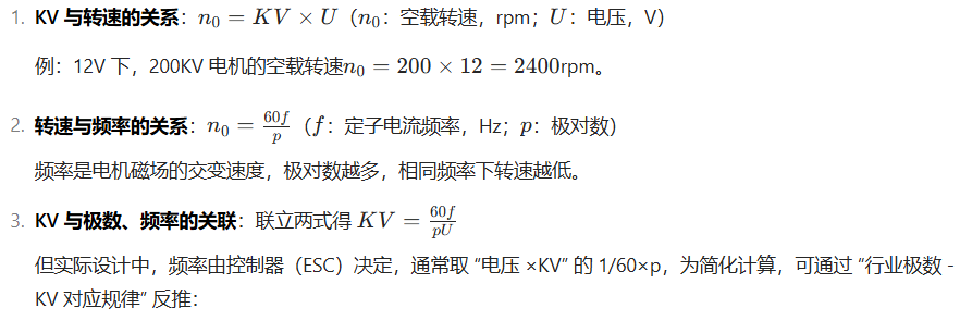 KV 值的定义是 “每 1V 电压下的空载转速(rpm/V)”,其本质与电机极数(2p,p为极对数)直接相关,公式推导如下: