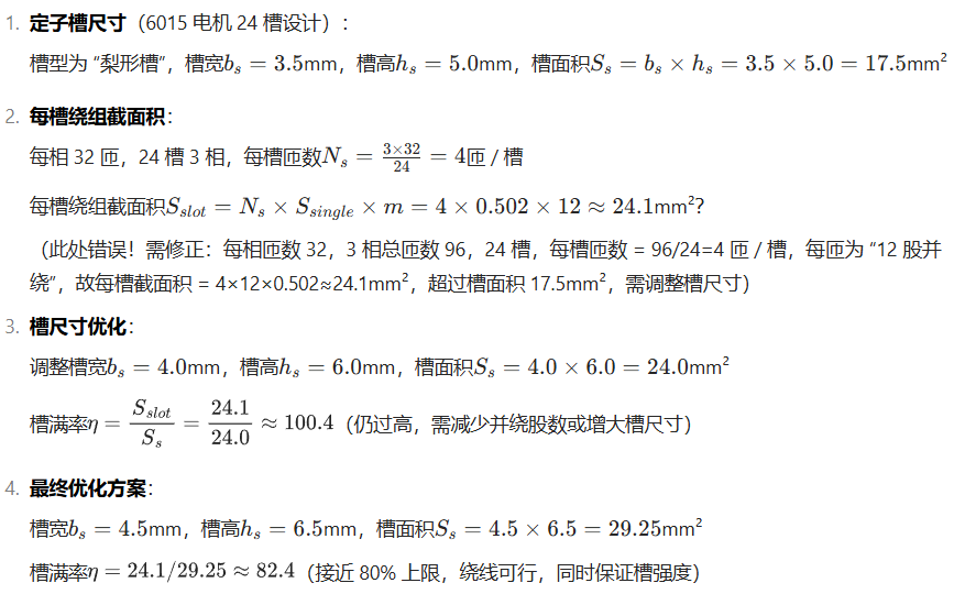 槽满率是绕组截面积与定子槽面积的比例,需控制在 70%~80%(过高绕线困难,过低效率低)。