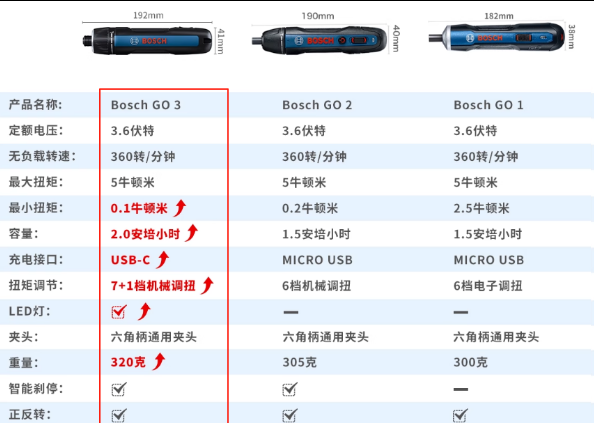 - 电压与功率平衡:始终采用 3.6V 锂电池,避免高电压带来的安全风险与体积增加;通过提升功率密度(GO3 功率密度达 0.476W/g,较 GO1 提升 25%),在低电压下实现高动力输出,适配家具组装、电子维修等消费场景。